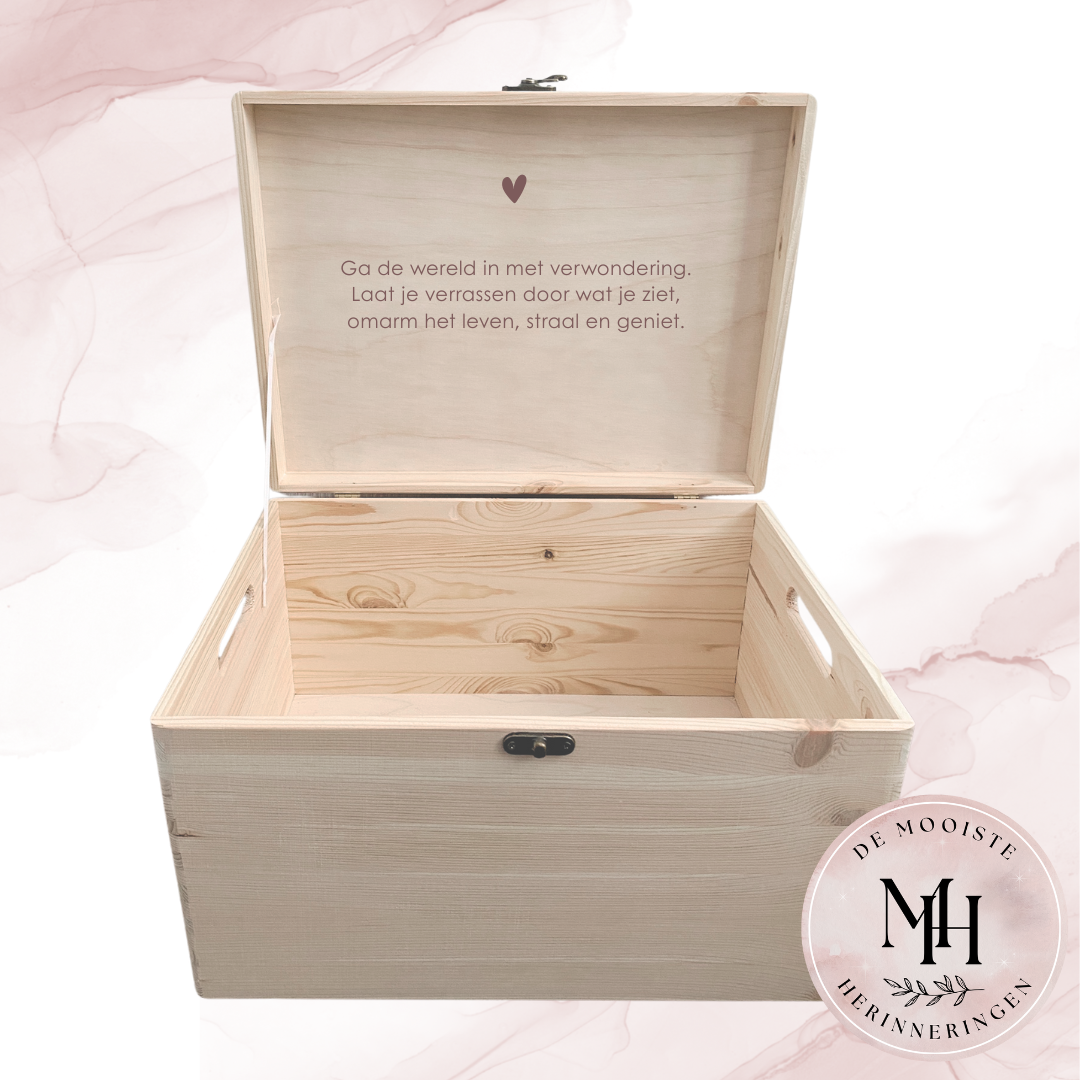 Bewaar in deze gepersonaliseerde houten herinneringskist, de mooiste en meest dierbare (tastbare) herinningen van je kindje. Leuk voor nu en voor later. Ook geweldig als kraamcadeau!