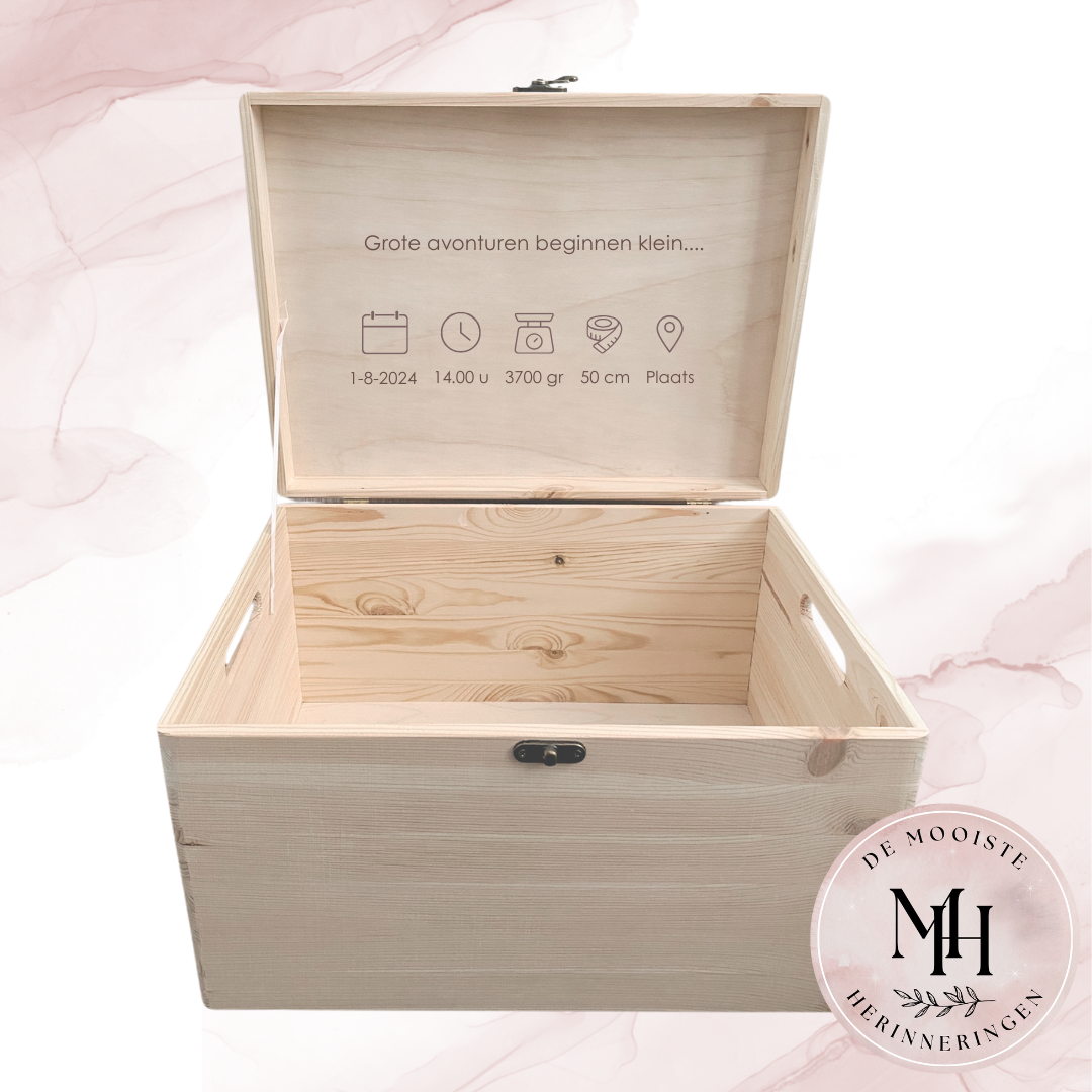 Kies ervoor om de geboortekaartjes, echo foto's, het geboortepakje, de eerste schoentjes, tandjes, de mooiste tekeningen, knutselwerkjes, diploma's en natuurlijk de foto's en filmpjes veilig in deze herinneringskist te bewaren.